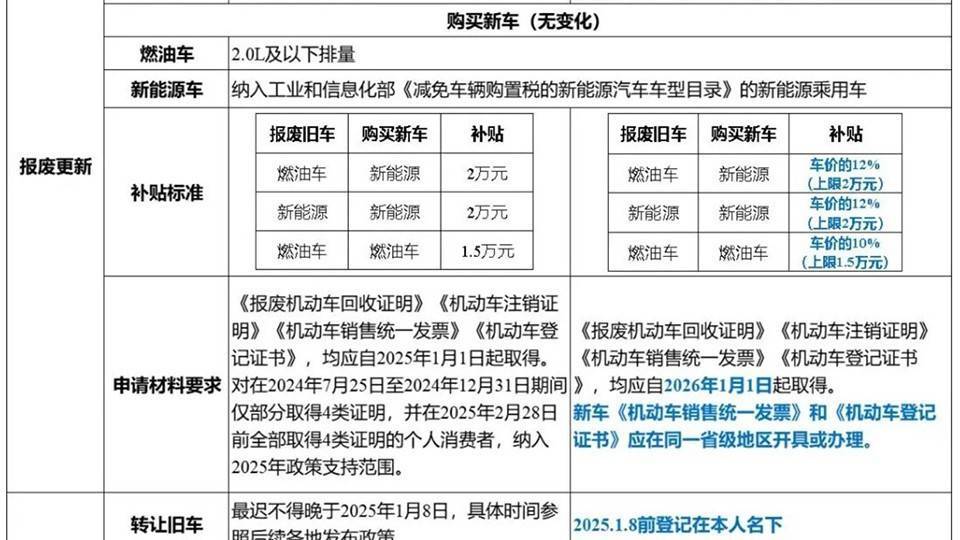2025年的策略在旧车报废更新方面,还是较早期策略有所扩大,将部分合适条目的“国四”排放圭臬燃油乘用车纳入了补贴畛域,并明确了燃油车(汽油、柴油偏激他燃料)和新动力乘用车的具体注册登记截止日历。